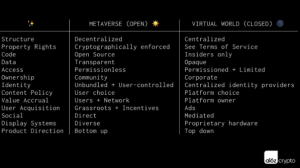 An open Metaverse is decentralized, allows users to control identity, enforces property rights, aligns incentives. And ensures value accrues to users (not platforms). An open Metaverse is also transparent, permissionless, interoperable, and composable (others can freely build within and across Metaverses), among other criteria.